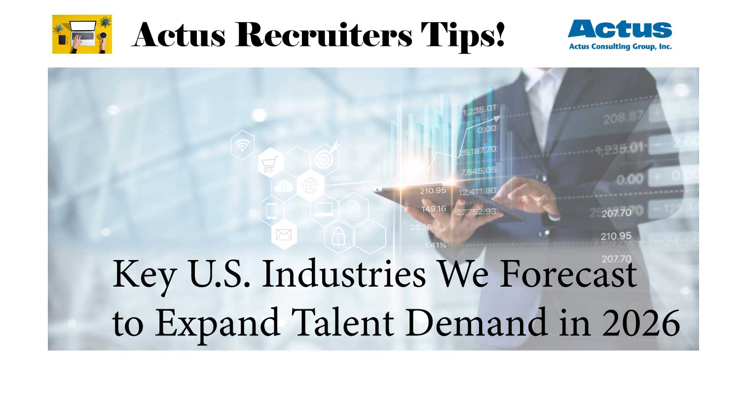 アメリカで職を探している求職者にとって、2026年は新たなチャンスの年になりそうです。弊社にも、求職者の方より、たくさんのご連絡をいただいておりますが、弊社リクルーターは、特に以下の業界・職種でアメリカでの求人の需要が高まることが予想しております。